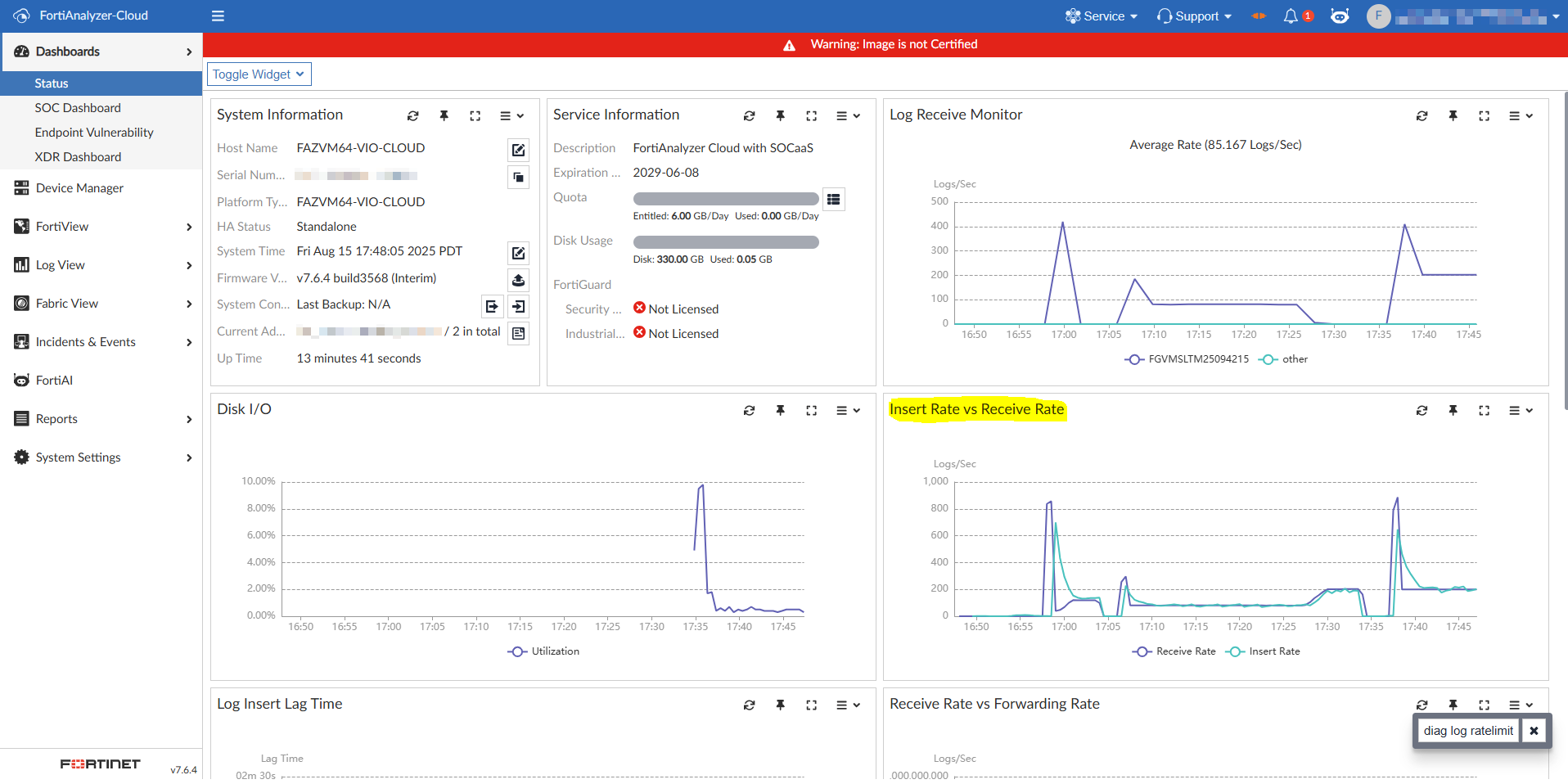 FortiAnalyzer Cloud displays information about the rate limit, tokens, and dropped logs.