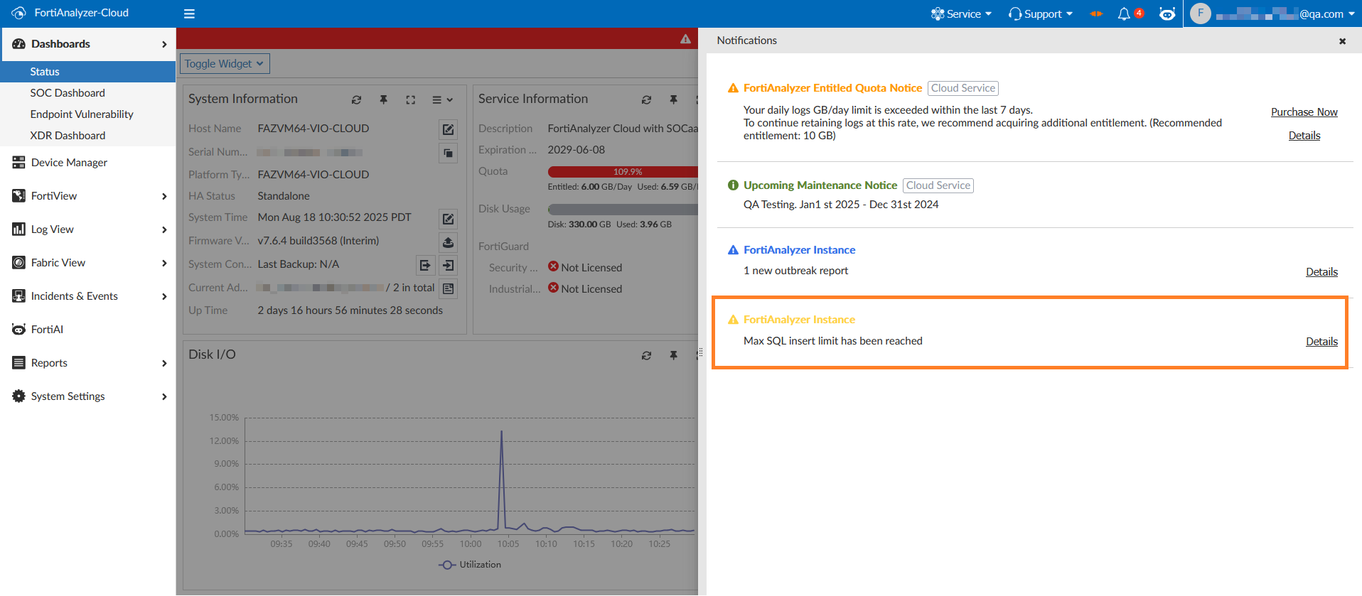 The Peak Log Rate and Sustained Log Rate is displayed for your FortiAnalyzer Cloud instance