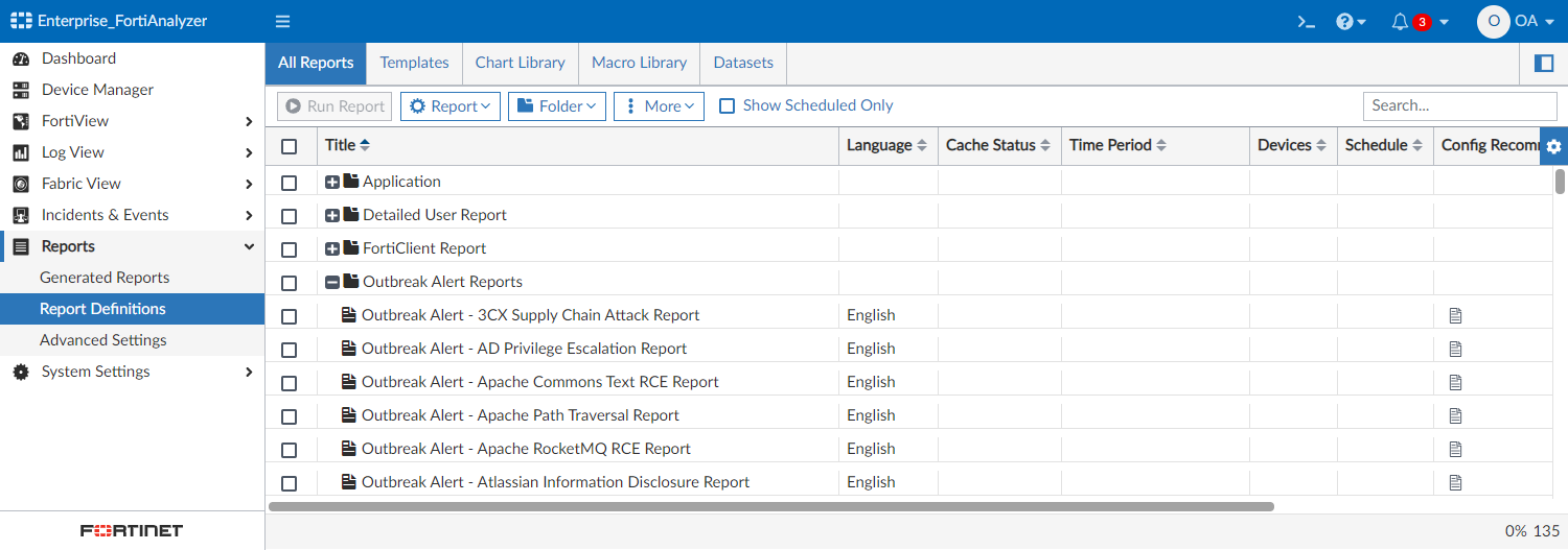 With a valid license, the FortiAnalyzer Outbreak Detection Service automatically downloads event handlers and reports created by Fortinet in response to known outbreaks. This section includes information on how to view downloaded outbreak event handlers and reports.