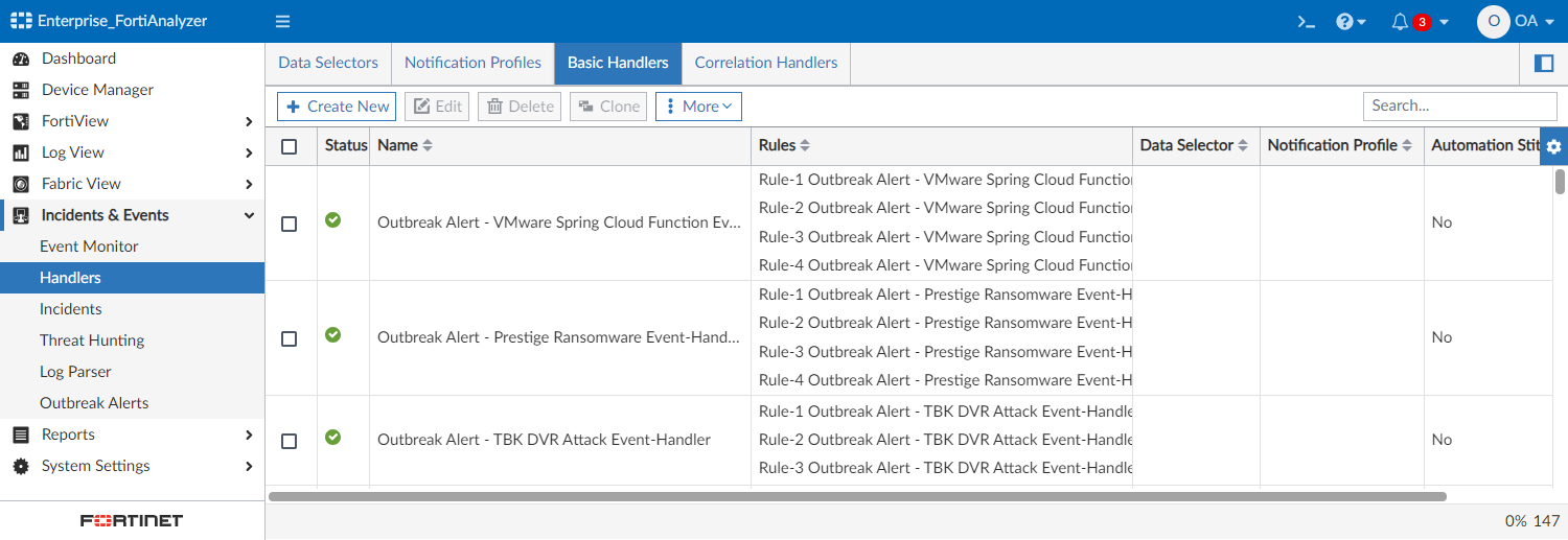 Event handlers created by the FortiAnalyzer Outbreak Detection Service are displayed with the Outbreak Alert prefix. See Event handlers.