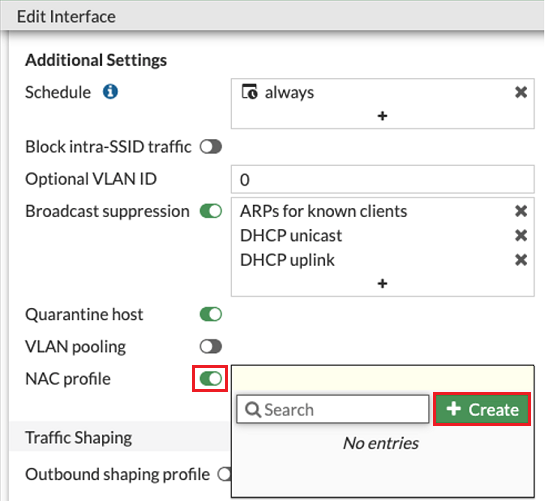 In the SSID Edit Interface screen, confirm the NAC profile is enabled and that the onboarding profile is correct.