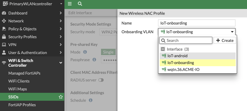 In the FortiGate WiFi controller, VLANs can be added to Wi-Fi SSIDs. Each SSID can be thought of as a logical switch. To utilize FortiLink NAC device identification and VLAN assignment, an SSID needs: