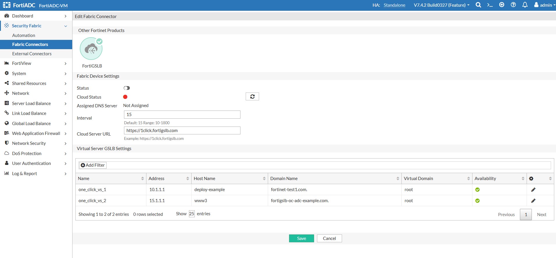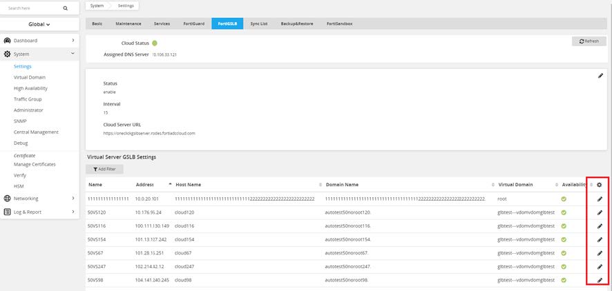 - Navigate to Security Fabric > Fabric Connectors > GSLB) Click edit on the far right. Here you will connect FortiADC to GSLB.