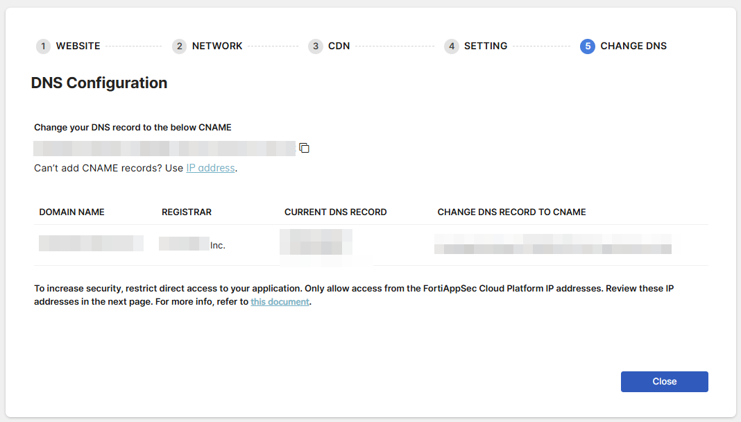 This section displays configuration instructions for settings managed outside FortiAppSec Cloud. Changing your DNS record according to the instructions below ensures that your application traffic is routed through FortiAppSec Cloud, where it is filtered for security before reaching your application servers.