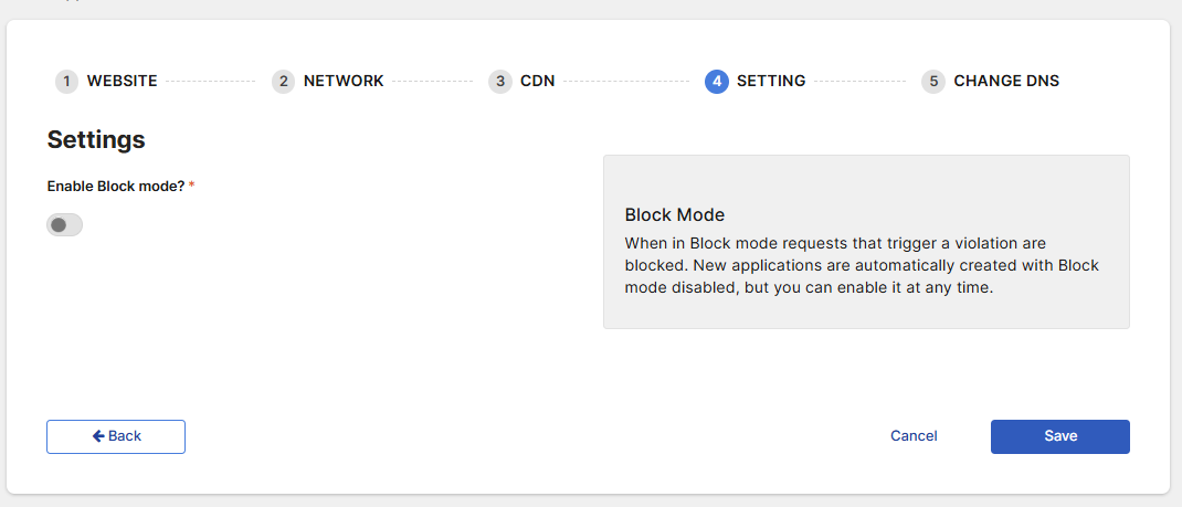 You can later enable the Block Mode in Dashboard when you are confident that the traffic flow is stable and the legitimate traffic is not falsely blocked as attacks.