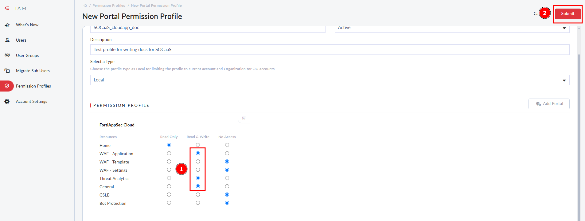 - Set WAF - Application, General and Threat Analytics to Read & Write. Click Submit.
