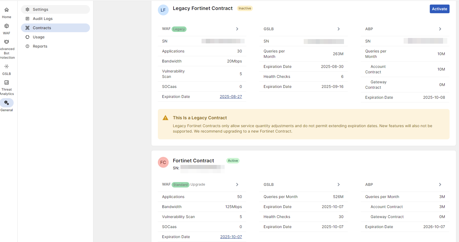 After purchasing the new contract, please log into your FortiAppSec Cloud portal and navigate to General > Contracts.