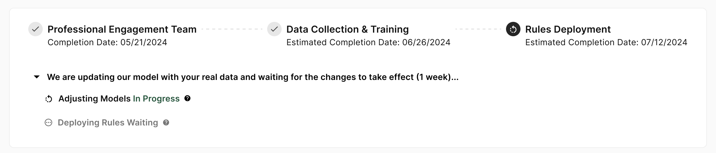 The duration of this phase depends on the website's complexity and the volume of traffic data, typically ranging from 2 to 4 weeks. You can find the completion date displayed on your dashboard.