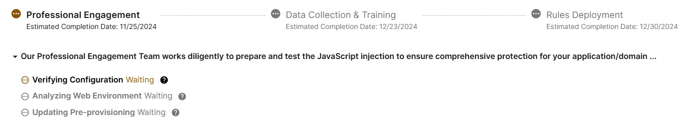 Once a ABP Application is created, the Pre-Provisioning process begins, prompting the Professional Engagement Team (PET) to analyze your application details, identify URLs for protection, and insert the required JavaScript for Advanced Bot Protection. While no action is needed from your end, if you wish to modify or add entries, please submit a request with Fortinet Support.
