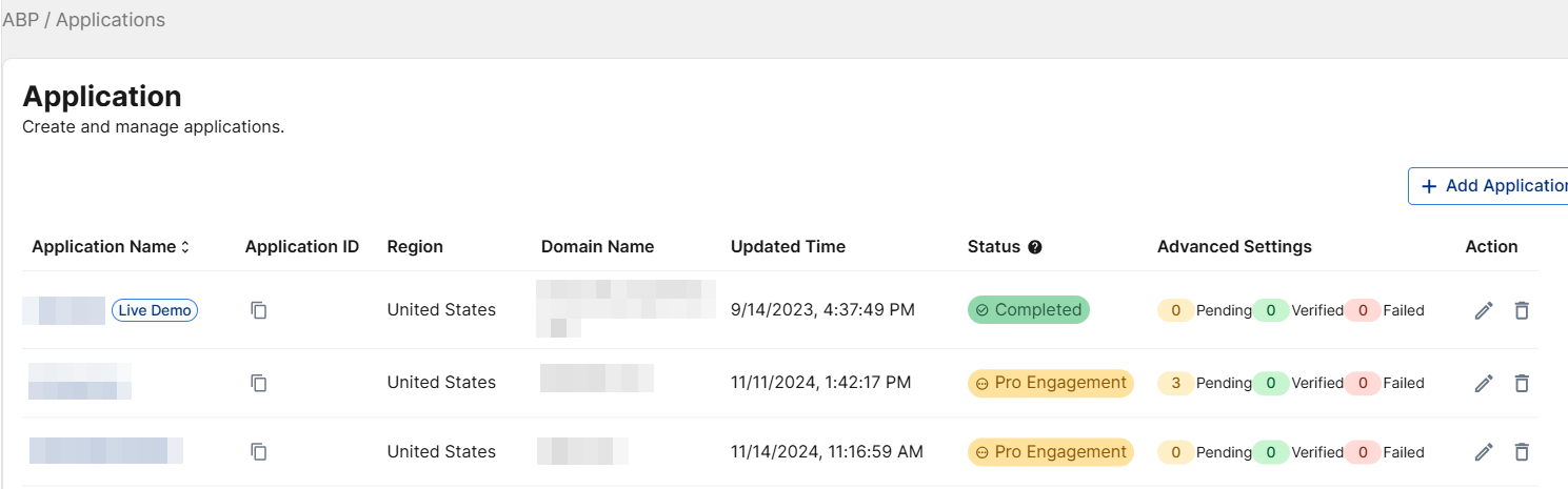For more detail on the Pre-provisioning status of a specific application, access its ABP Traffic Insights Dashboard by clicking on its Application Name, or by clicking on it's Status and selecting View Dashboard.