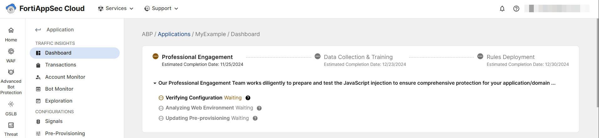 There is no need to wait until the pre-provisioning process is complete to continue onboarding ABP. After you have created the ABP Application, you can begin configuring the ABP integration in the Fortinet Fabric device (such as FortiADC and FortiWeb). However, the Advanced Bot Protection functionality will not activate until your ABP Application is fully analyzed and Pre-Provisioned. For information on the next steps, see Integrating Advanced Bot Protection into the Fortinet Security Fabric.