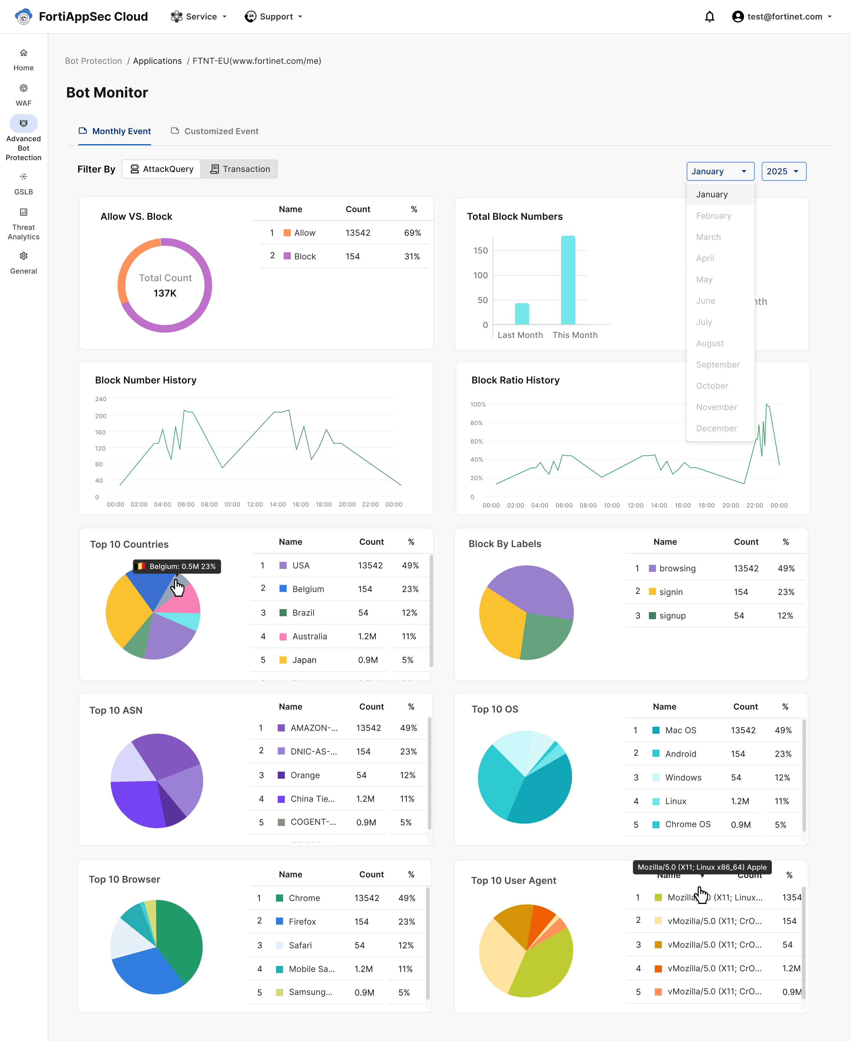 Track monthly bot activity or define special events to create reports on your application's activity during specific time frames.