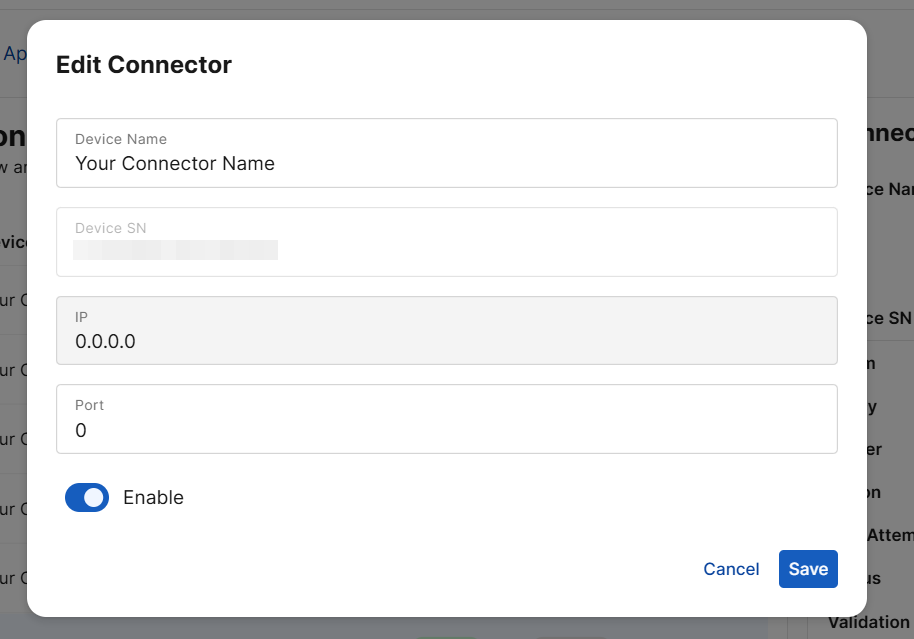In rare troubleshooting scenarios when ABP does not correctly fetch the device IP or Port, you may edit these fields. However, this does not affect the connection of ABP to the connector device.