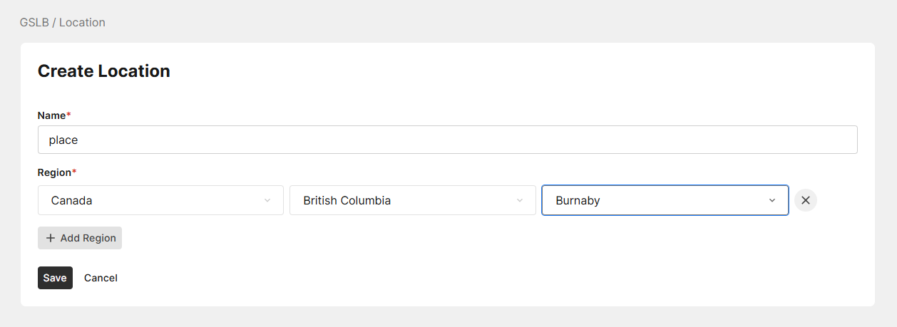 Valid characters areA-Z,a-z,0-9,_, and-. No spaces. After you initially save the configuration, you cannot edit the name. - Click Add Region to add a location record.