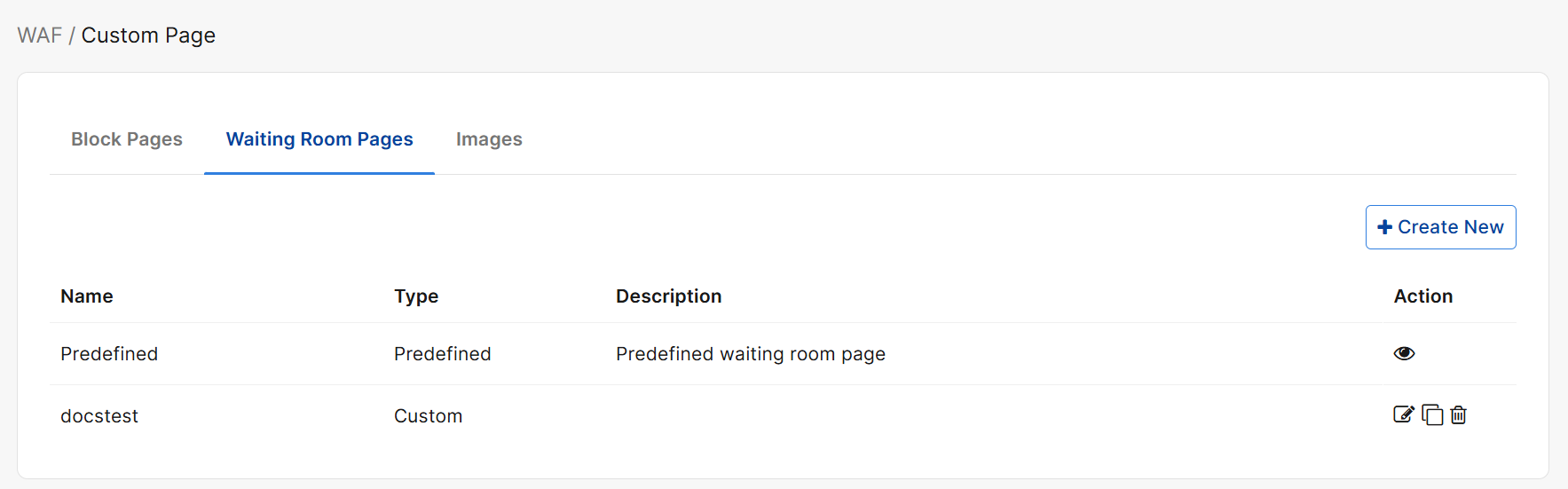 Once you have created a Waiting Room Page, you can edit, clone, or delete it under the Action column on the Custom Pages > Waiting Room Pages page.