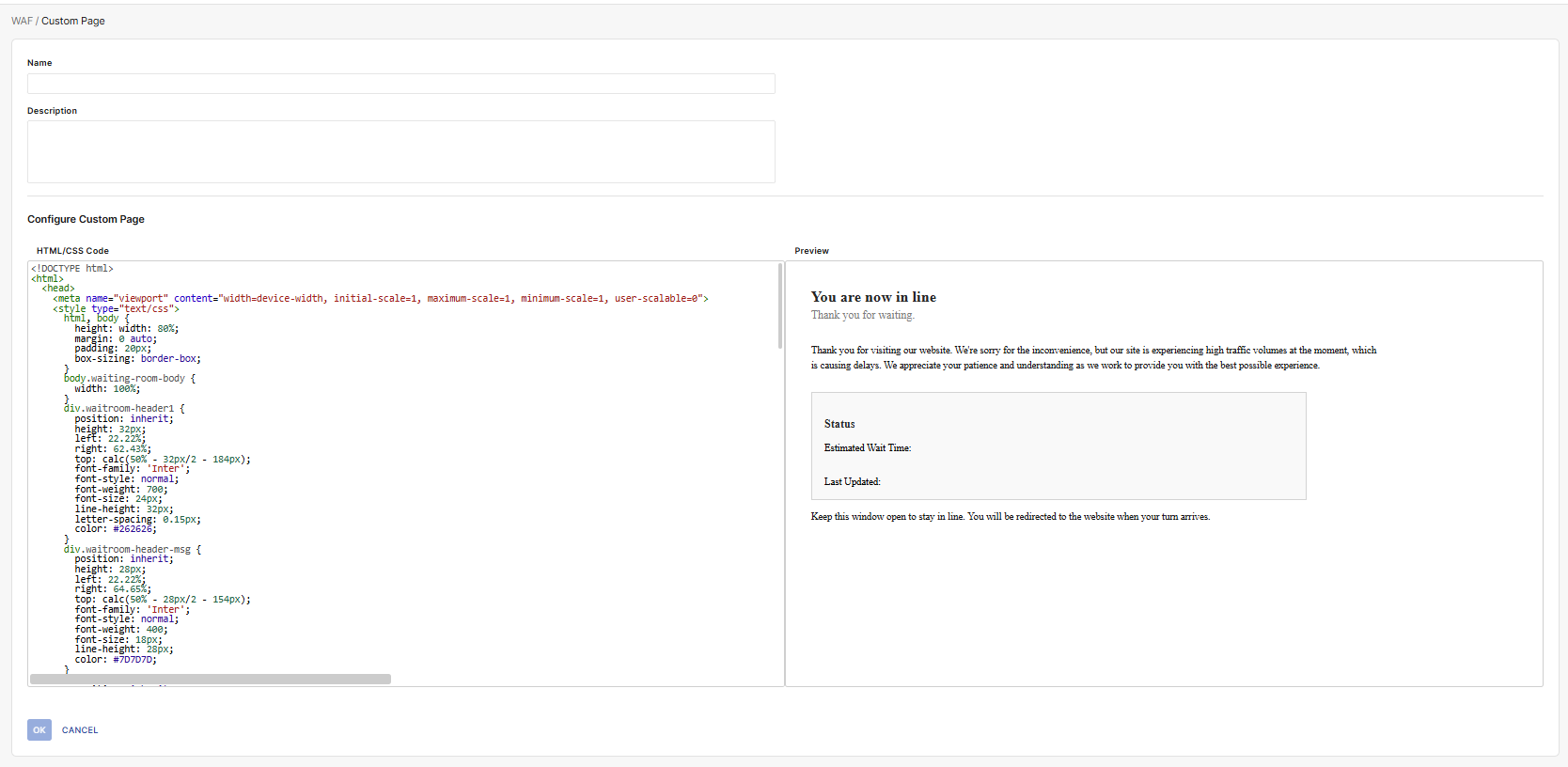 Navigate to WAF > System Settings > Custom Pages> Waiting Room Pages