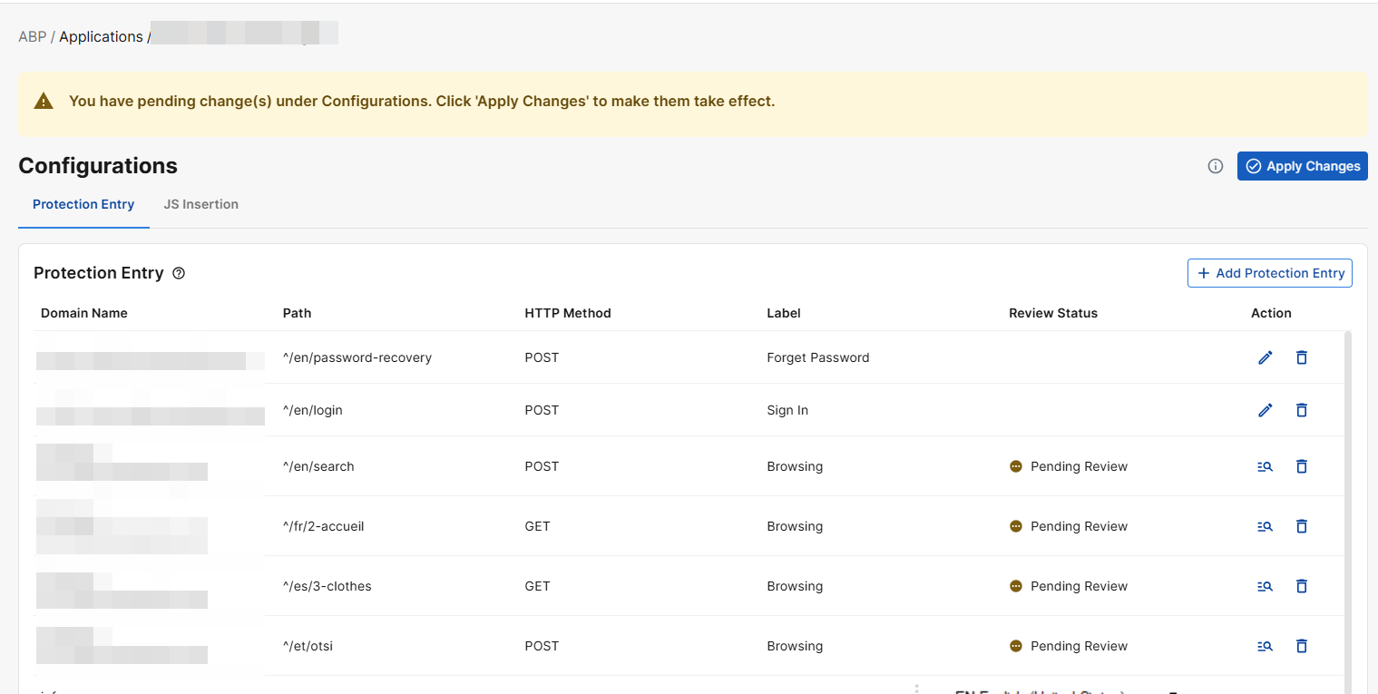 The Protection Entry table lists all the URL paths under your Application domain that ABP has identified should be protected.