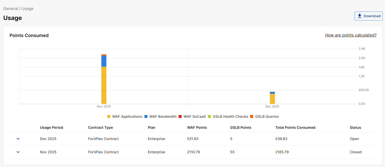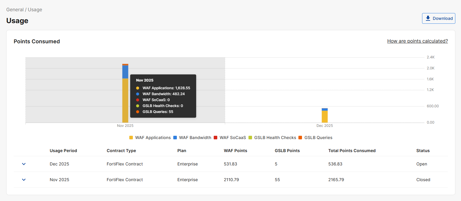 When you are using an AWS/GCP/Azure marketplace or FortiFlex contract, this page displays the number of points consumed by your application, split by bandwidth, WAF applications, GSLB Queries, and GSLB Health checks.