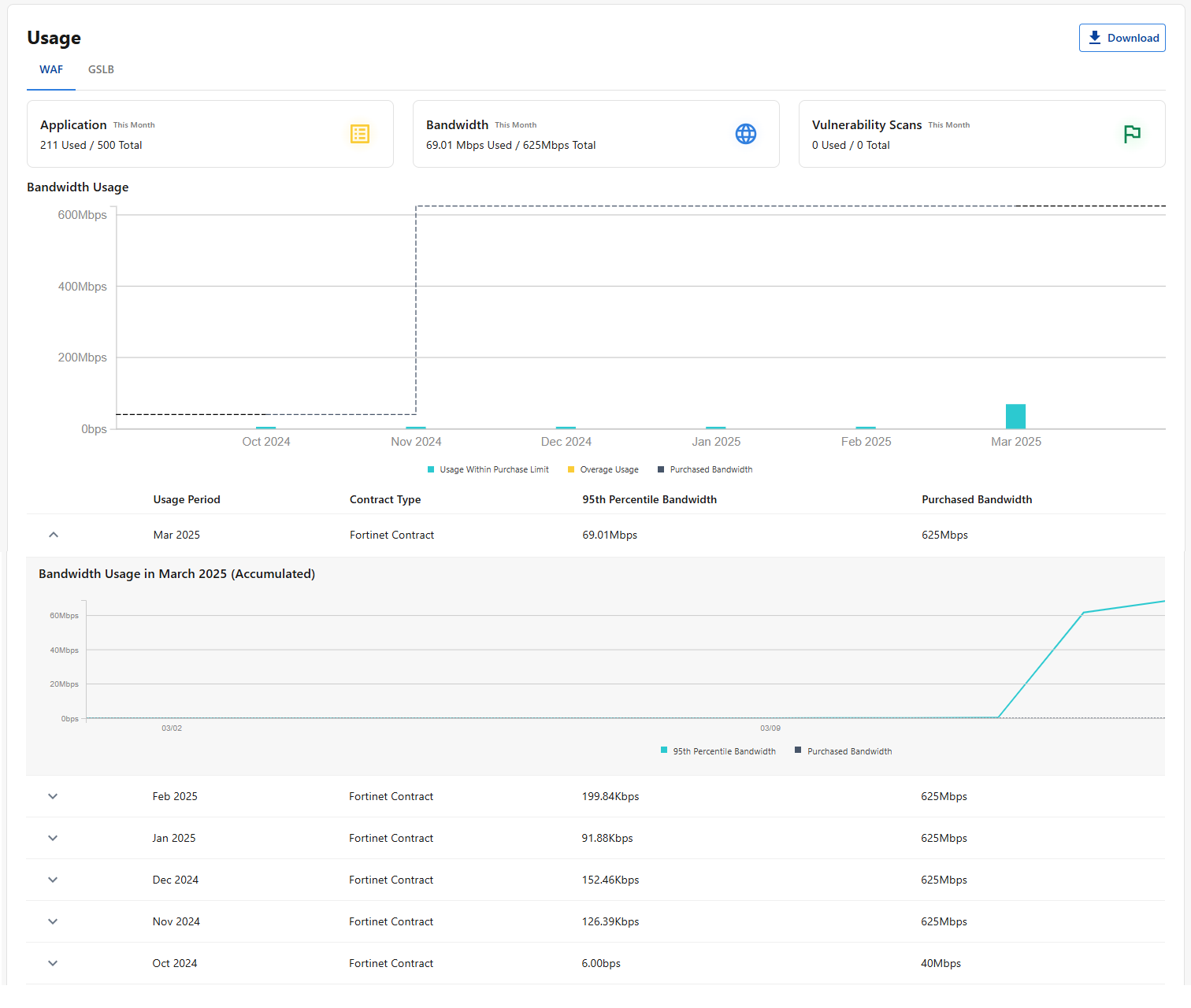 The application-level 95th-percentile bandwidth usage is not displayed in the web portal. You can retrieve this data through the API using: For more information, please refer to the FortiAppSec Cloud API documentation. |