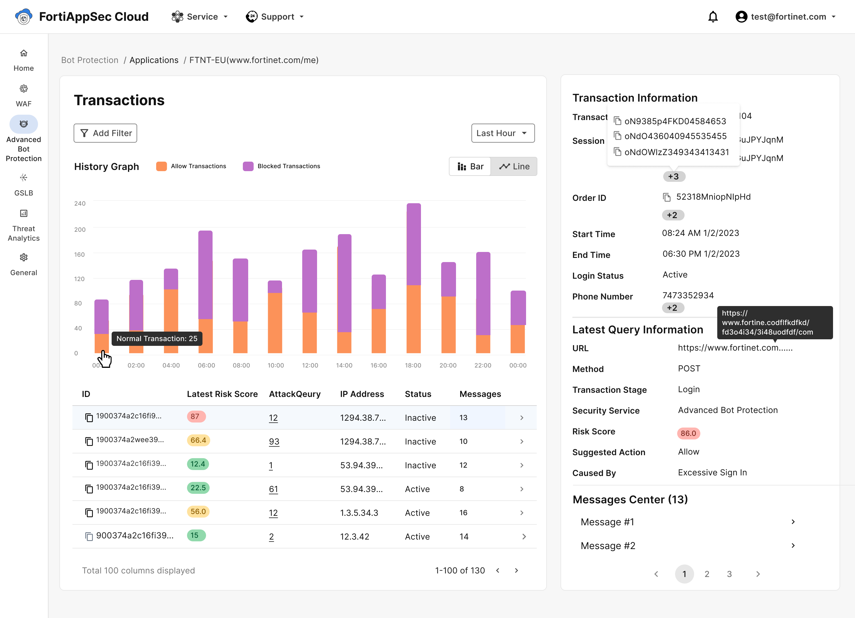 Latest Query Attribute Description URL The URL at which the latest query took place on your application's domain. Method The HTTP method behind the latest query. Transaction Stage Describes the stage at which the last query took place. This value may provide insight into the nature of the transaction. Risk Score Risk scores can range from 0-100. Higher scores indicate more bot-like behavior, while lower scores suggest human-like activity. For more information on the factors that go into calculating the Risk Score, please see Overview. Security Service This value is determined by the terms of your license. Suggested Action The response FortiAppSec Cloud recommends based on the risk score. Caused by A brief explanation behind Suggested Action. -