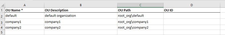 Edit the downloaded template, and update the values under OU Path to include the top-level organization's name, followed by a backslash.