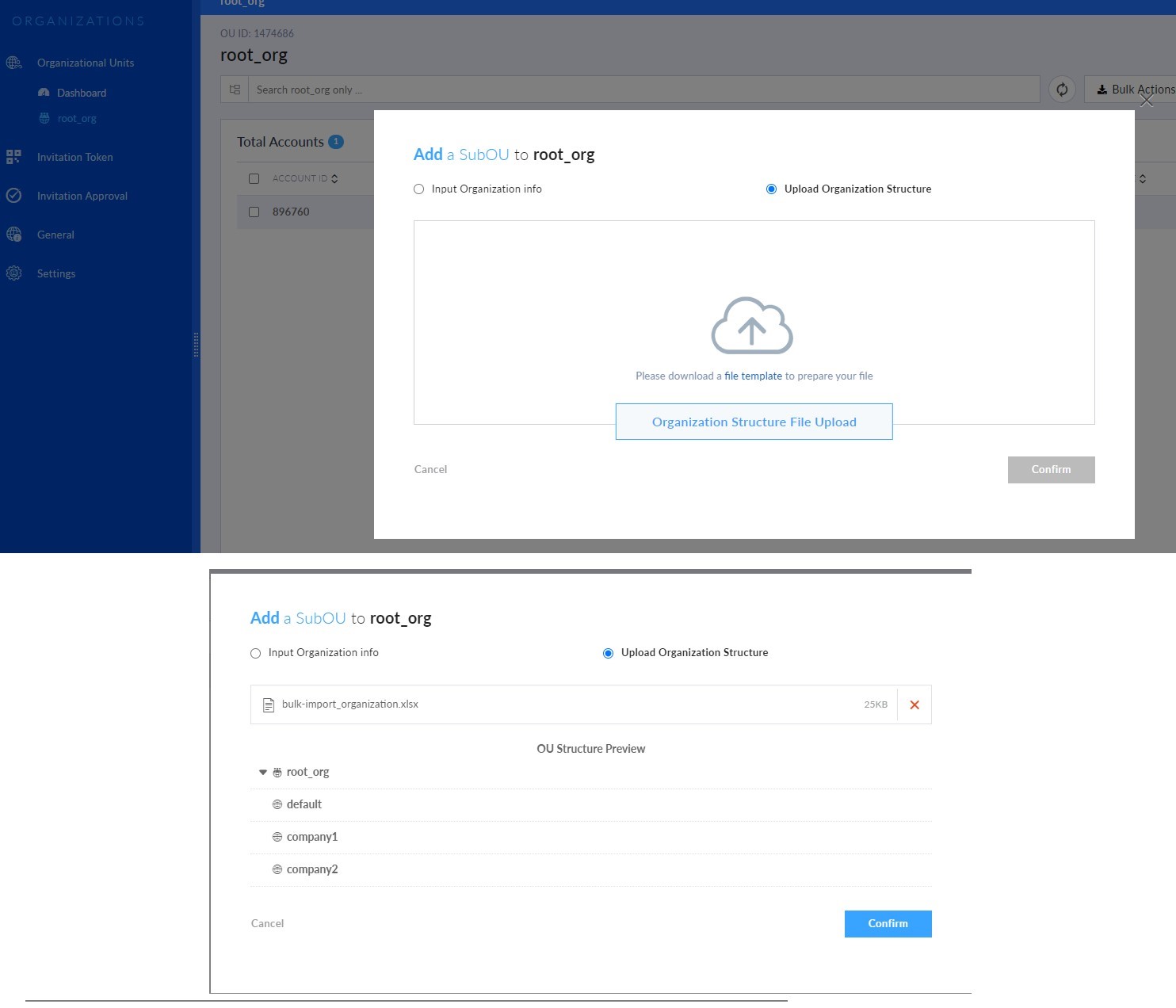 Select Upload Organization Structure, and upload the updated template from step c. This should auto-populate the OU Structure Preview window.