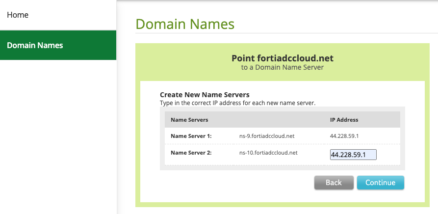 - Under Create New Name Servers, input the IP address for Name Server 1 and input the backup server's IP address for Name Server 2. If you do not have a backup server, input the same IP as Name Server 1 and click Continue.