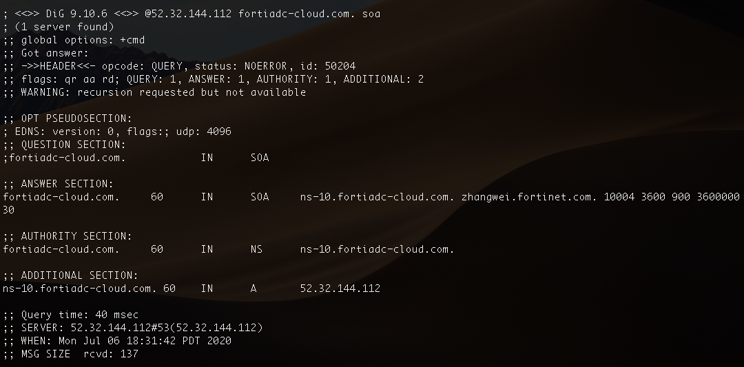 digfrom FortiAppSec Cloud to see your application's SOA records. Take note of your Name Severs and Glue Records. -