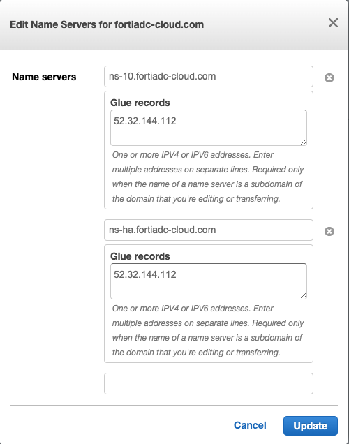 - Go to Add or edit name servers on the domain general information page. Set the Name servers and Glue records as SOA records directly taken from GSLB. Route 53 requires at least two name servers, so do not delete all other name servers.