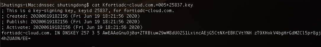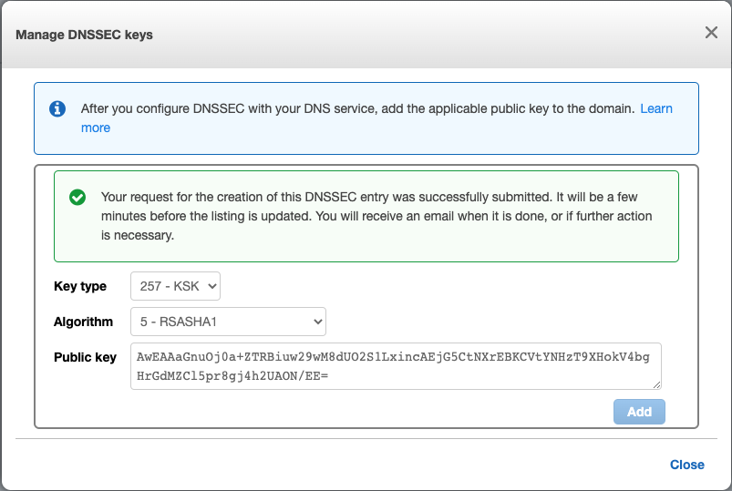 The following key file indicates that it is a key-signing key file and the algorithm is 5. Usually there will be two parts of the key, separated by a space. When you paste the key into Route 53 Manage DNSSEC keys, make sure to remove the space.