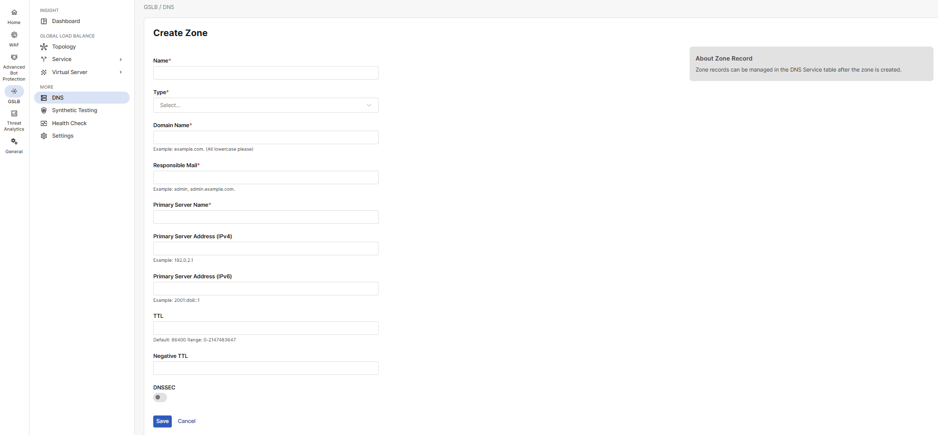 - To begin, prepare the domain within GSLB. Navigate to GSLB> DNS and configure the Zone service settings. Ensure to take note of the Domain Name, Primary Server Name, and Primary Server Address fields. We recommend setting the Primary Server Address to match the assigned DNS Server IP.