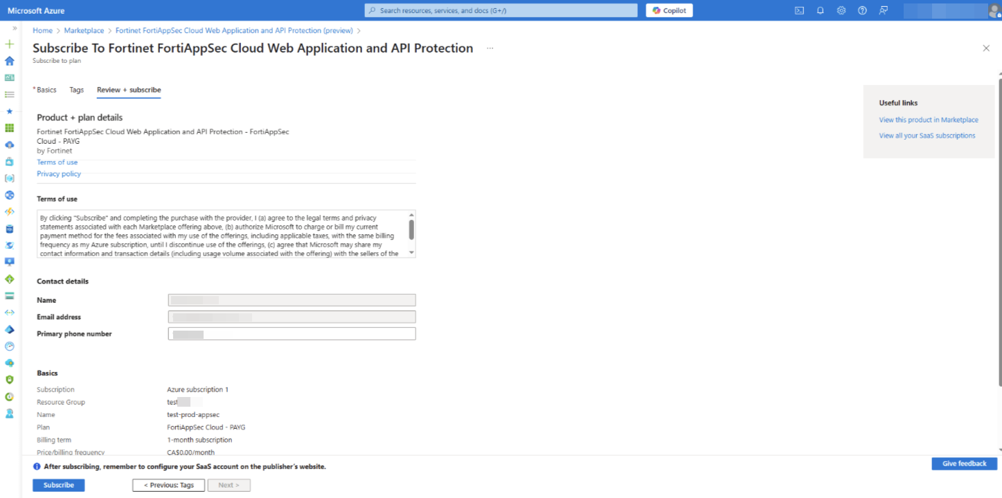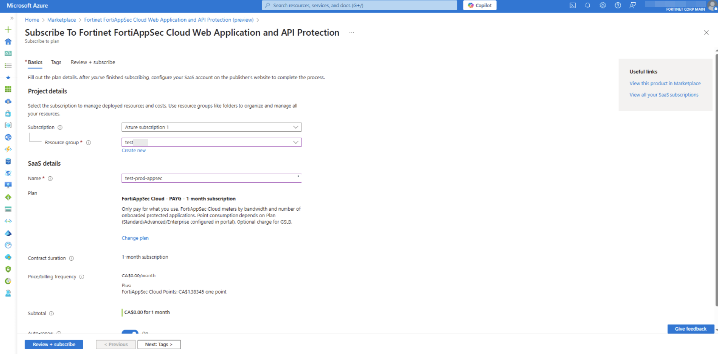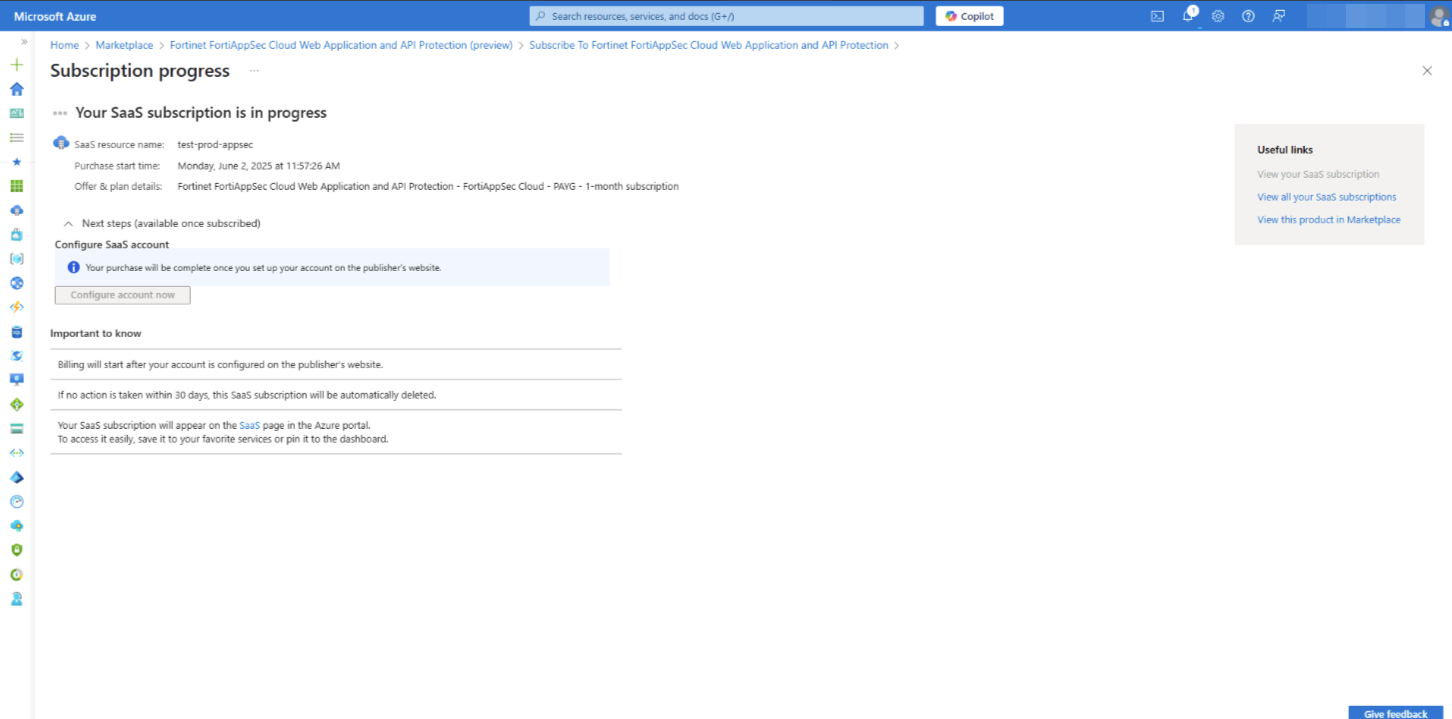 Follow the steps below to subscribe FortiAppSec Cloud on Azure and associate your Azure subscription with your FortiCloud account.