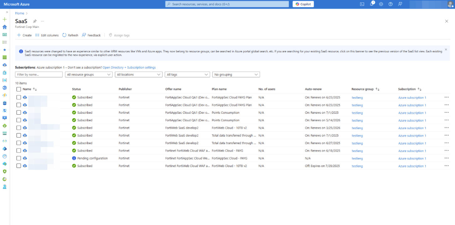 - If it does not appear, return to Azure Marketplace and search FortiAppSec Cloud WAF-as-a-Service. You should see a notice prompting you to complete the subscription process again.