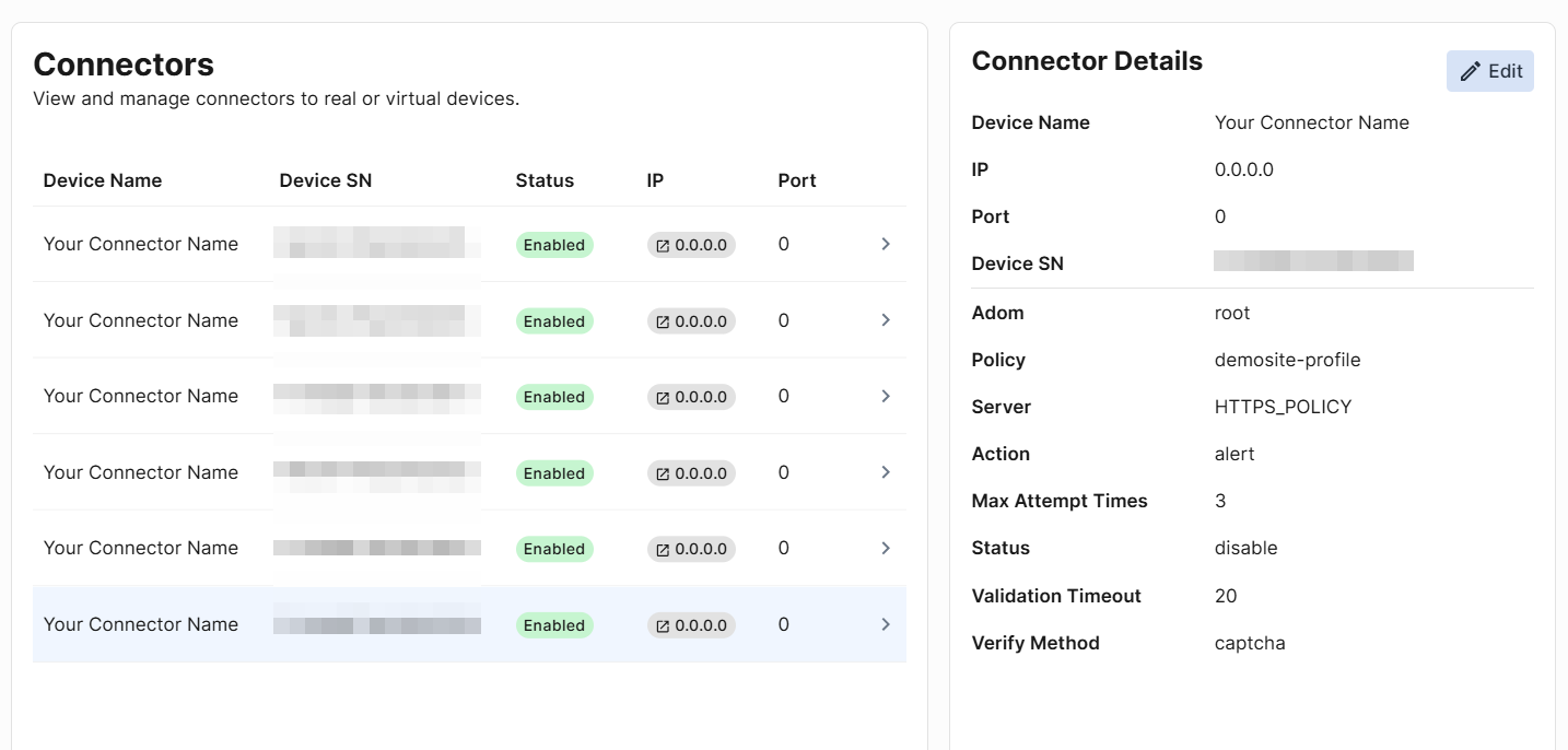 From the Connectors page, you can view the Fabric devices connected to FortiAppSec Cloud. This page contains details of each connector device, including their device serial number, IP address, port number, and more.