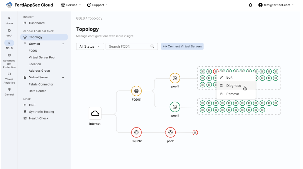 Run diagnostics on Virtual Servers, Fabric Connectors, and Health Checks directly from the GSLB Topology view by right-clicking the item and selecting Diagnose.