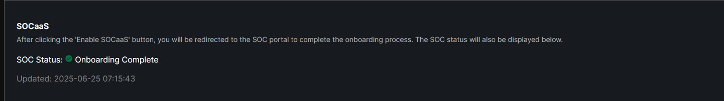 To enable SOCaaS for WAF applications, click the Enable SOCaaS button. This opens the SOCaaS portal to complete onboarding. For onboarding instructions within the SOCaaS portal, please refer to SOCaaS documentation.