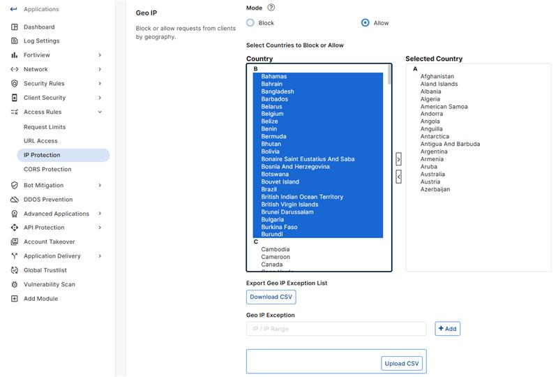 To configure blocking or allowing by geography, select a Mode to choose whether to Block or Allow the countries in the Selected Country list.