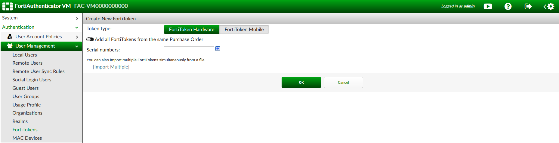 - Go to Authentication > User Management > FortiTokens, and select Create New.