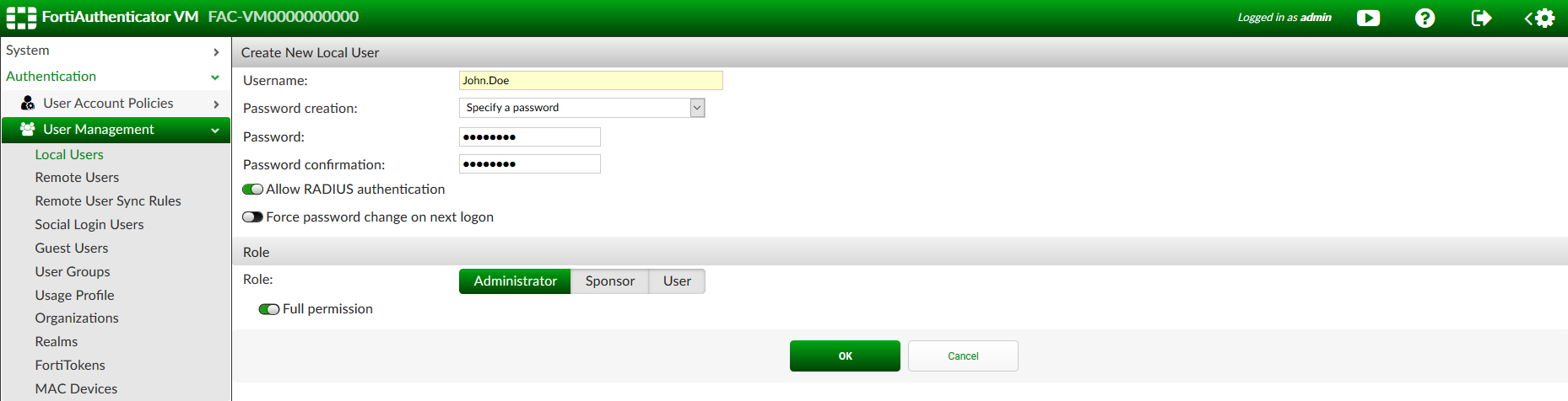 The configuration instructions included in this guide use the username John.Doe. - Enable Allow RADIUS authentication, and click OK to access additional settings.