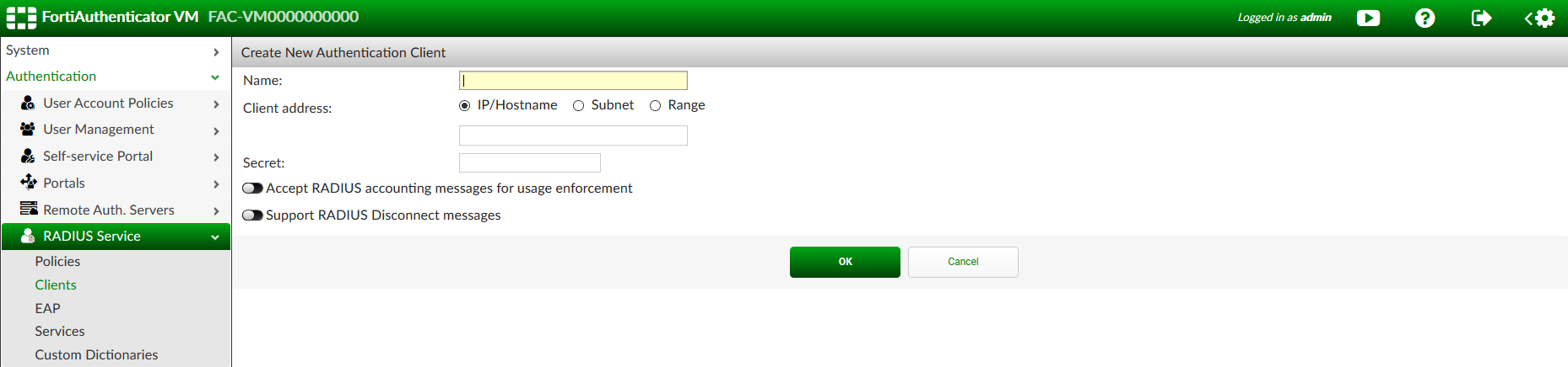 - In Authentication > RADIUS Service > Clients, click Create New.