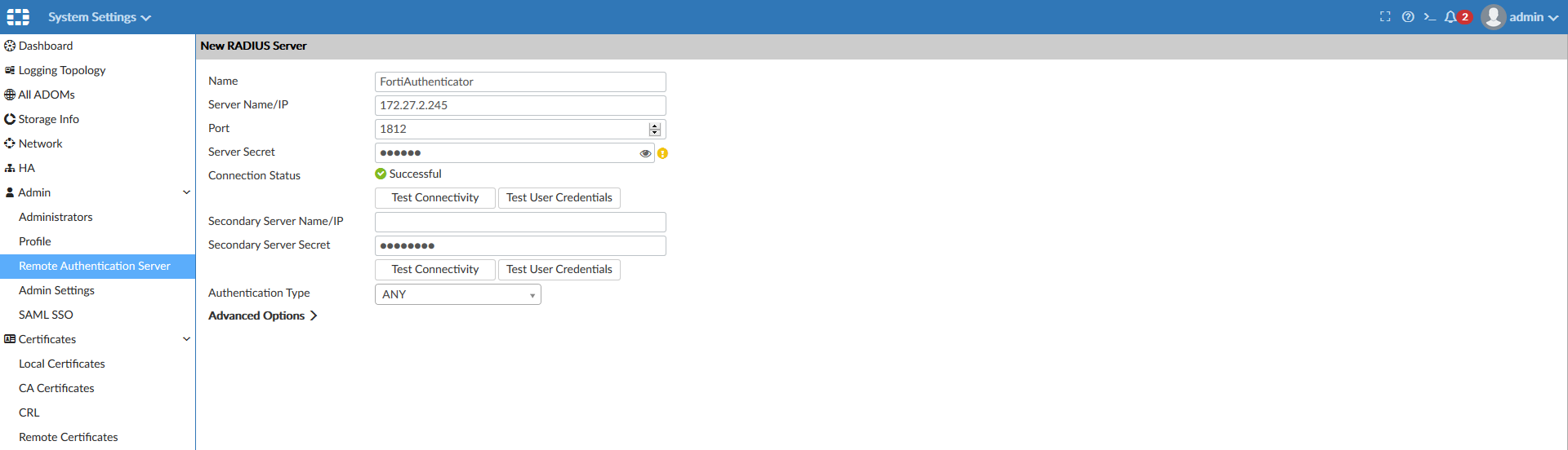 - In FortiAnalyzer, go to System Settings > Admin > Remote Authentication Server.