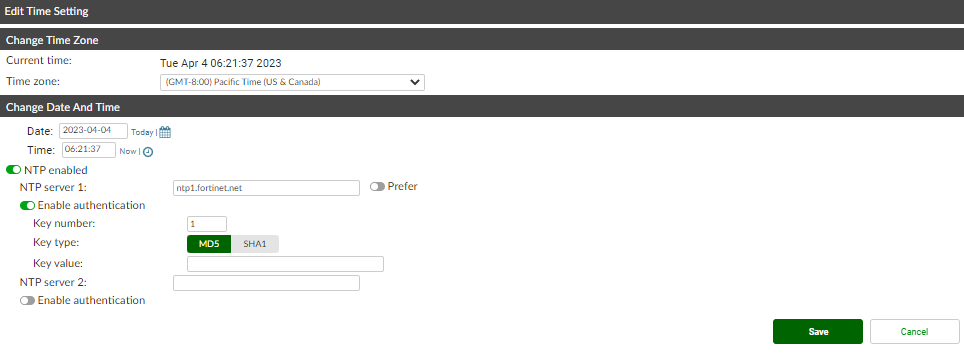 NTP enabled Enable this option to set an NTP server. Note that, if you configure both NTP servers, you can select Prefer to make NTP server 1 the preferred server. The NTP server 1 is set to ntp1.fortinet.net by default.