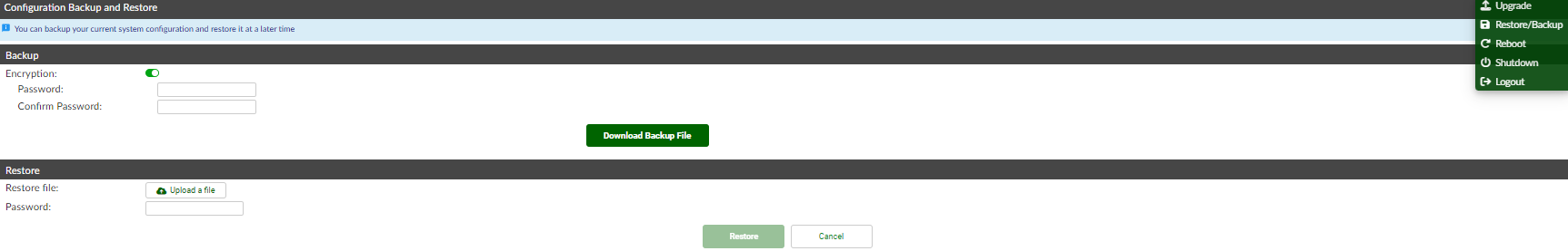 - In the user dropdown menu, select Restore/Backup. The Configuration Backup and Restore page opens.