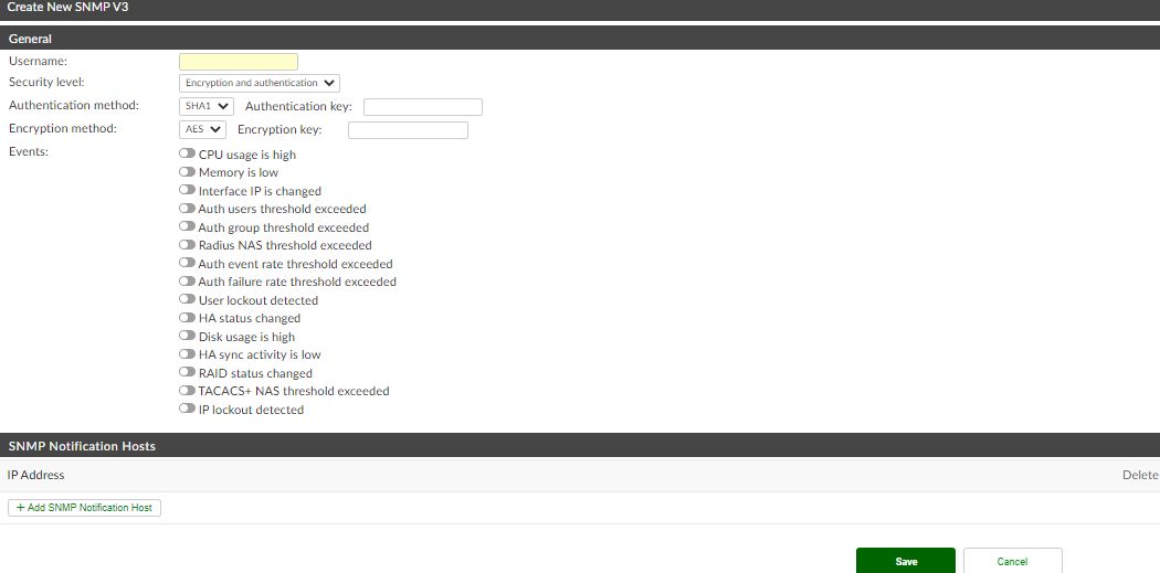 Events Select the events for which traps are enabled. See Events. - In SNMP Notification Hosts, select Add another SNMP Notification Host and enter the following information: