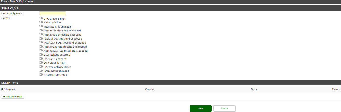 IP/Netmask Enter the IP address and netmask of the host. Queries Select if this host uses queries. Traps Select if this host uses traps. Delete Select to delete the host. - Select Save to create the new SNMP community.