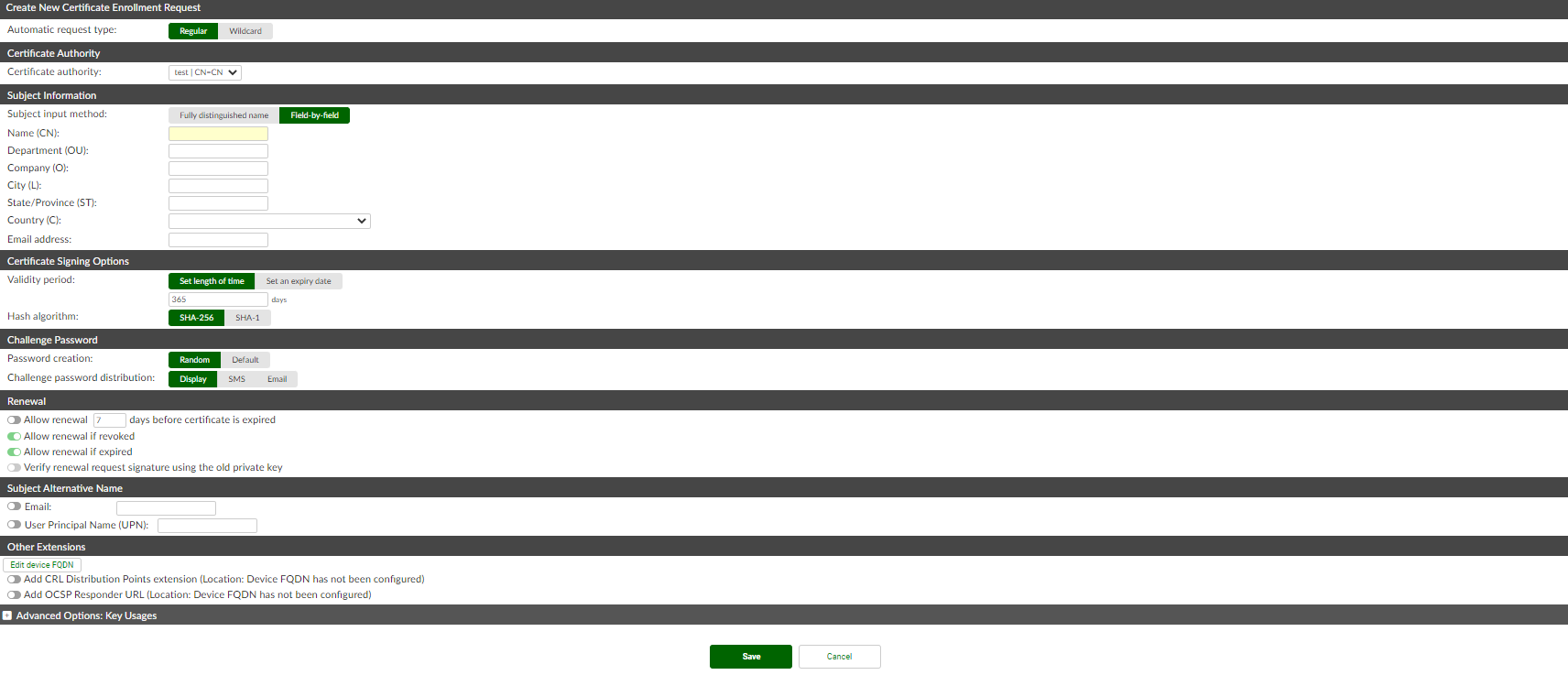 If the subject input method is Field-by-field, enter the subject name in the Name (CN) field (if the Automatic request type is set to Regular), and optionally enter the following fields: