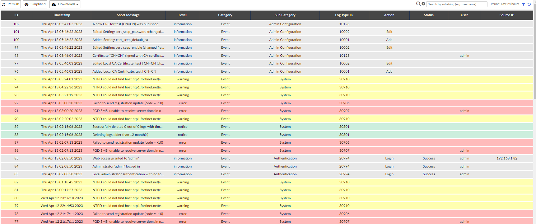The log message table can be sorted by any column. To sort the log entries by a particular column, select the title for that column. The log entries will now be displayed based on data in that column in ascending order. Select the column heading again to sort the entries in descending order. Ascending or descending is displayed with an arrow next to the column title, an up arrow for ascending and down arrow for descending.