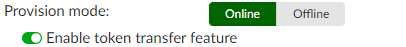 The option to Enable token transfer feature is available under Authentication > User Account Policies > Tokens when the Provision mode is Online.