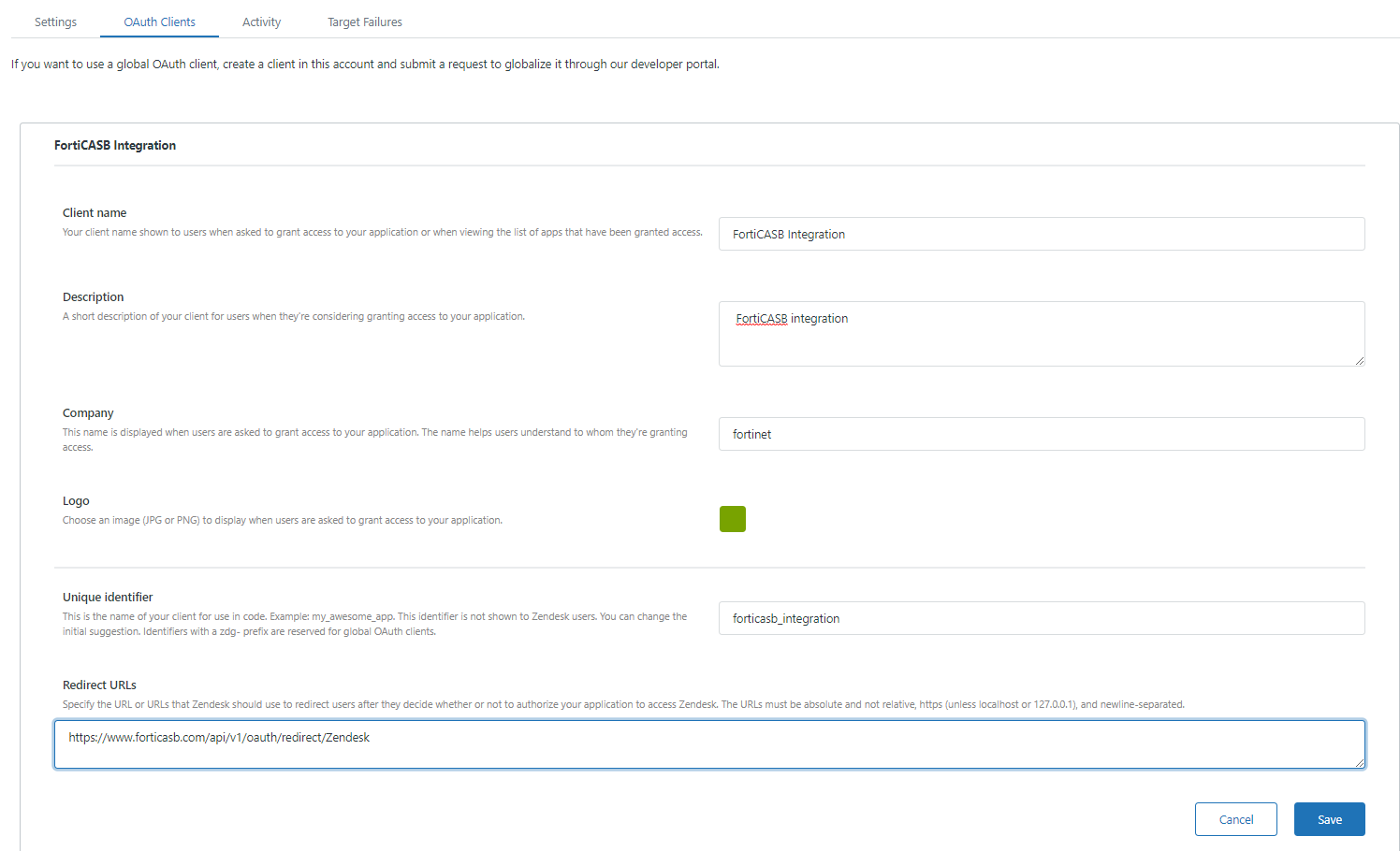 | Global Region | https://www.forticasb.com/api/v1/oauth/redirect/Zendesk |