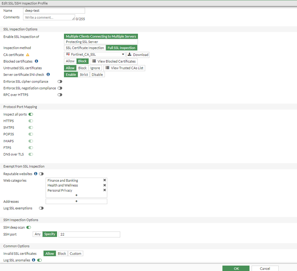 - Create a new SSL/SSH inspection profile called "deep-test".